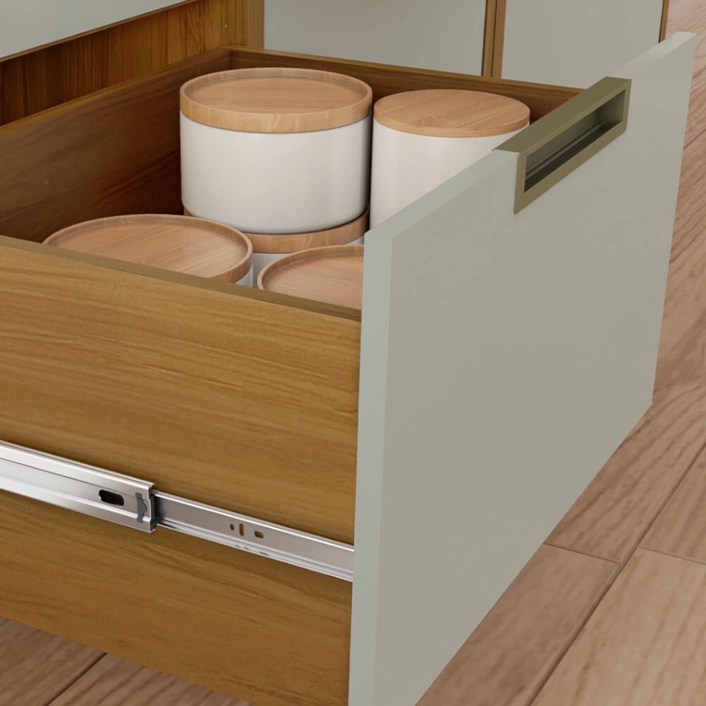 - Gavetão com lateral e traseira alta, possui corrediça telescópica (Três estágios)
