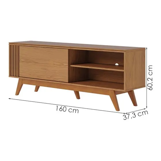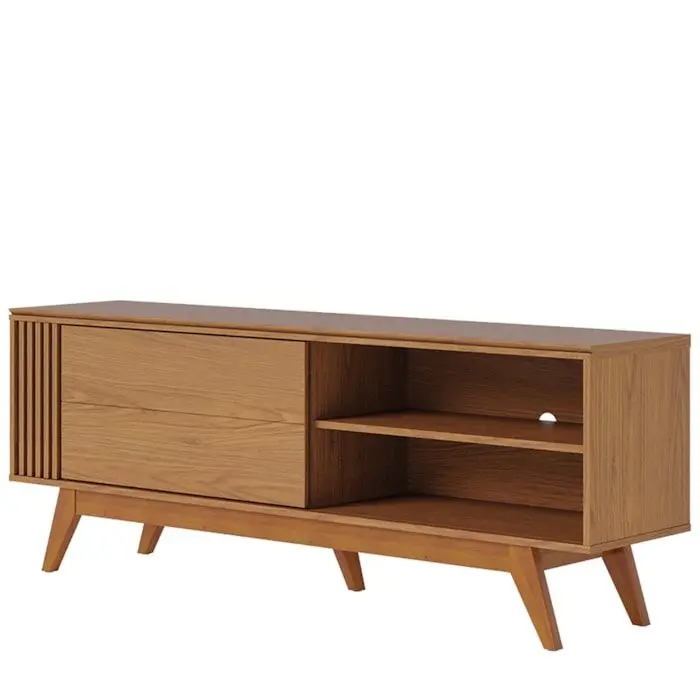 Design moderno e detalhes retrô, Rack Bancada Otawa é ideal para TVs de até 65 polegadas com segurança. Possui estrutura em MDP/MDF (12 e 15 mm) com acabamento em pintura UV texturizada (fosco/brilho). O tampo conta com detalhe chanfrado, porta de correr com ripado decorativo (alto relevo), prateleira funcional e passa fios embutido. Os pés são em madeira maciça, no estilo retrô que valoriza qualquer ambiente. Este produto chegará em sua casa separado em 1 volume.