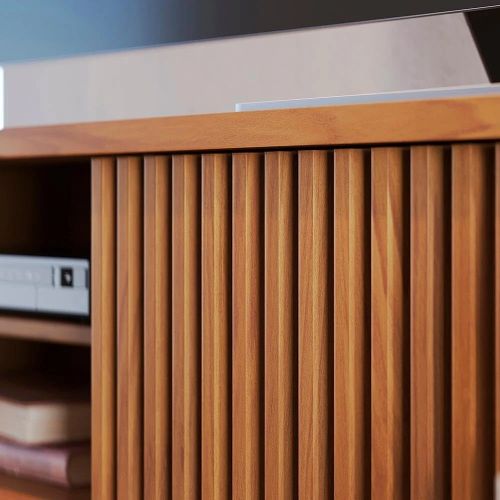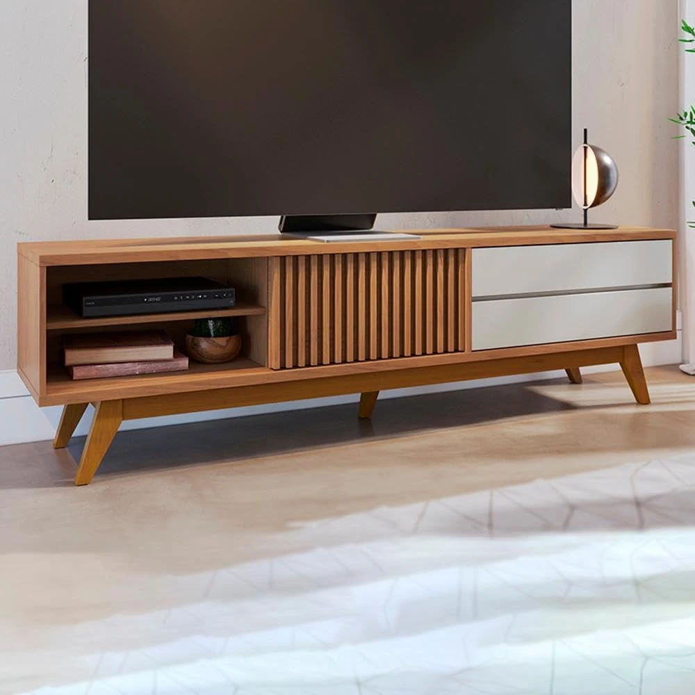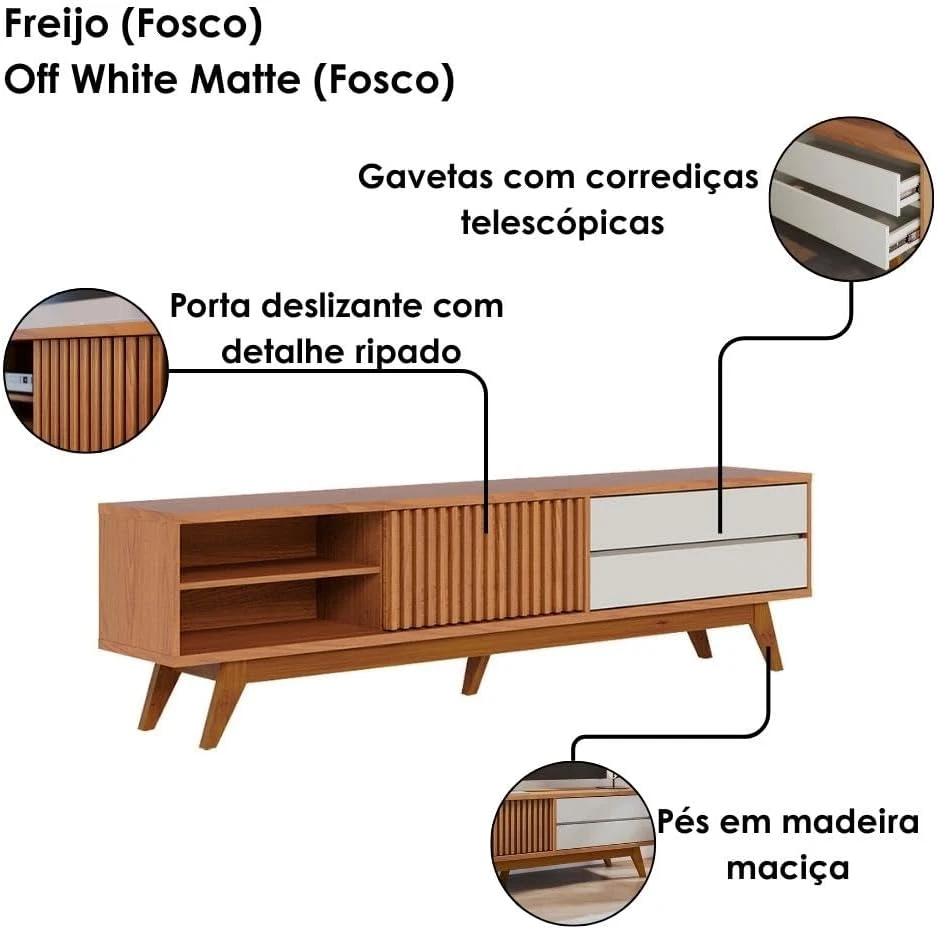 O Rack Veneza funde estilo contemporâneo e praticidade para criar um ambiente sofisticado e funcional. Equipada com 5 pés de madeira maciça e travas em MDF, esta peça oferece estabilidade e elegância em igual medida. Seus detalhes cuidadosamente elaborados incluem 2 gavetas com corrediças telescópicas, uma porta deslizante ripada que adiciona um toque de volume, e uma prateleira dedicada para aparelhos eletrônicos.
