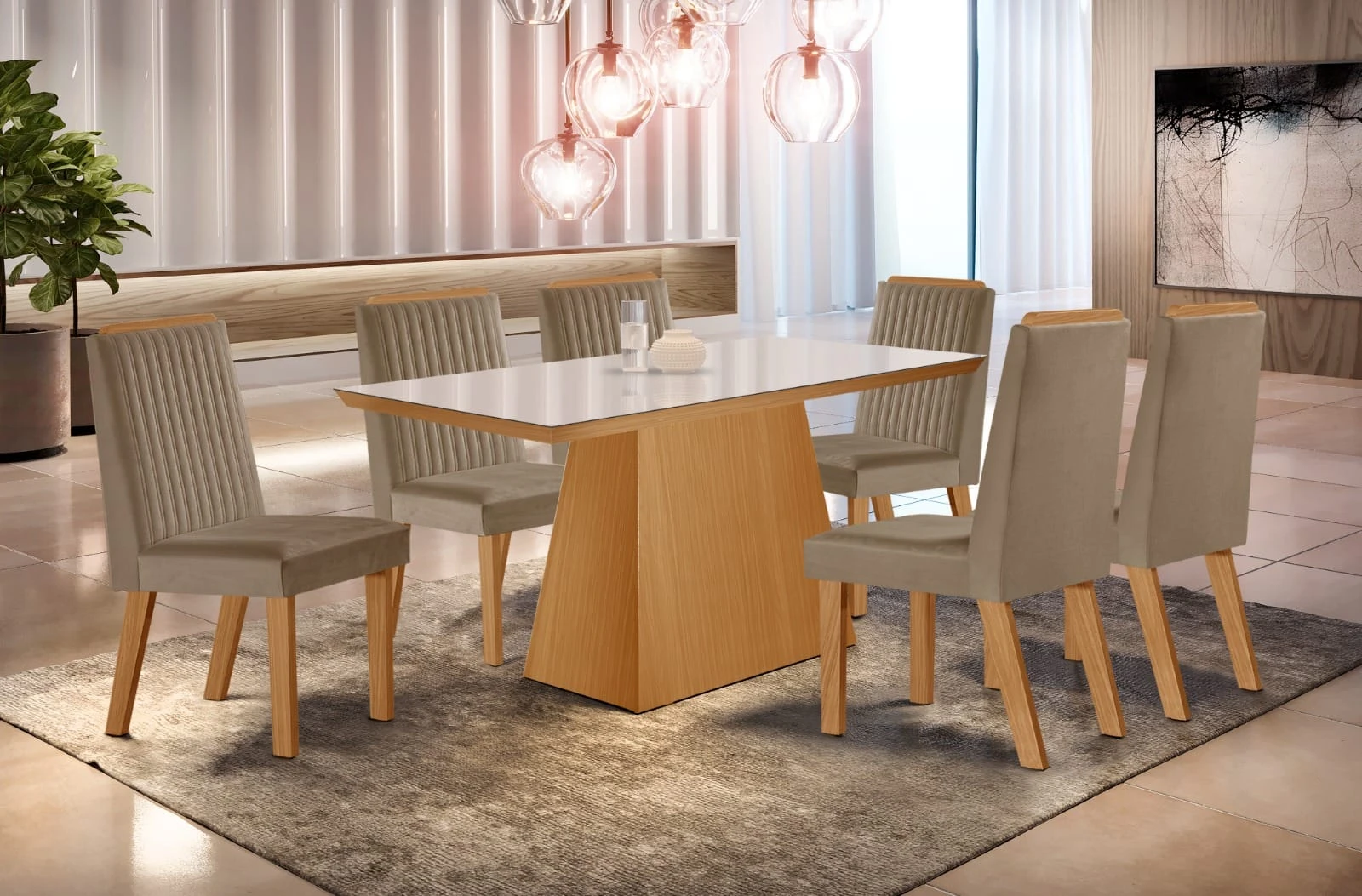 Conjunto de Mesa com Cadeiras - Pintura UV Castanho Cinamomo e Vidro Off White. Ideal para quem busca uma opção elegante e funcional para refeições e reuniões em casa, com um design que valoriza a decoração do ambiente e proporciona praticidade e estilo. • Tampo de vidro temperado e serigrafado, durável e moderno; • Estrutura robusta em MDF/MDP com acabamento em pintura UV; • Capacidade de até 50 kg para suportar refeições e objetos; • Design sofisticado na cor castanho cinamomo com vidro off white; • Necessita montagem, com peças de fácil encaixe e instalação. Explore toda a funcionalidade e elegância que esse conjunto oferece para seu espaço.