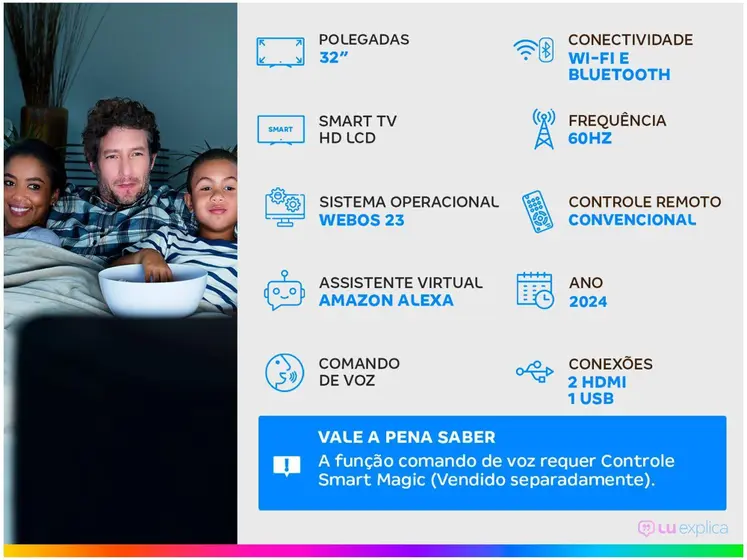 A Smart TV LG 32LR600BPSA de 32" é a escolha ideal para quem busca uma TV com excelente qualidade de imagem e recursos avançados. Com resolução HD (1366x768) e 60Hz Nativo de frequência, ela oferece imagens nítidas e detalhadas, perfeitas para assistir filmes, séries e programas de TV. Além disso, o display LCD garante cores vivas e contrastes intensos, proporcionando uma experiência visual mais imersiva. Conta com o sistema operacional webOS 23, que oferece uma interface intuitiva e fácil de usar. Ela é equipada com o processador AI α5 4K Ger6, que garante imagens mais nítidas e com cores mais vibrantes. Outro destaque é a presença da assistente virtual Alexa, que permite controlar a TV por meio de comandos de voz (requer uso do Smart Magic que deve ser adquirido separadamente). Ainda, possui 2 entradas HDMI e 1 USB, para conectar dispositivos externos. Com ela, você terá uma experiência visual incrível, com imagens nítidas, cores vivas e contrastes intensos.